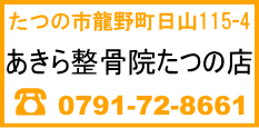 院名 あきら整骨院たつの店 住所 〒679-4161 兵庫県たつの市龍野町日山115-4 営業時間 平日